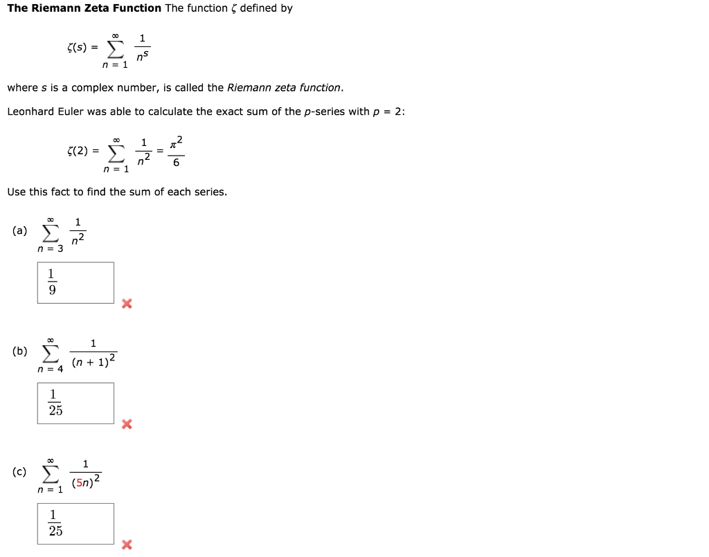 The value for zeta2sum_k1infty1k2 1 can be found using a number of different techniques Apostol 1983 Choe 1987 Giesy 1972 Holme 1970 Kimble 1987 Knopp and Schur 1918 Kortram 1996 Matsuoka 1961 Papadimitriou 1973 Simmons 1992 Stark 1969 1970 Yaglom and Yaglom 1987. The approximate Zeta function 55 1. Here are three methods to calculate the non-trivial zeroes of the Rie.